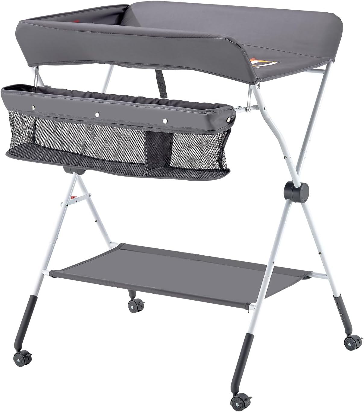 Portable Folding Design: Featuring a quick-fold design and 4 lockable, silent swivel wheels, this baby changing table is easy to store and transport. The raised edges provide full 360° security protection, ensuring your baby is secure while you work.