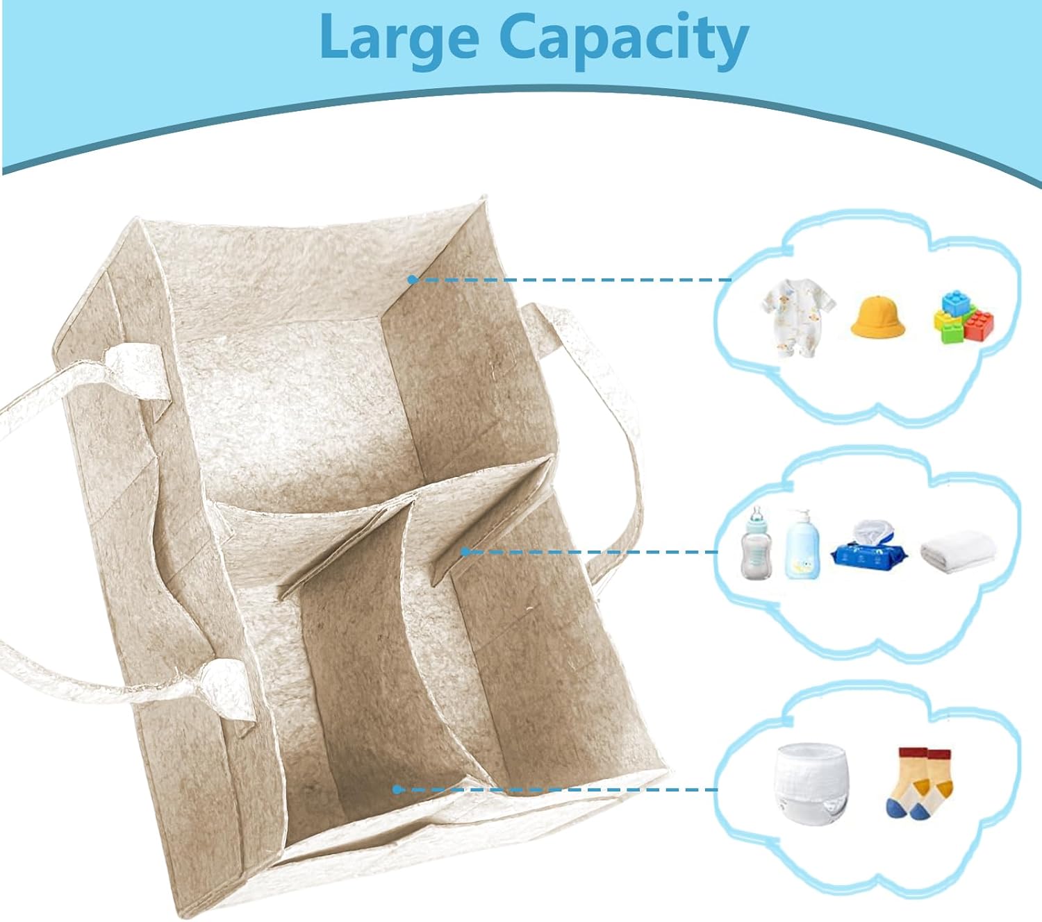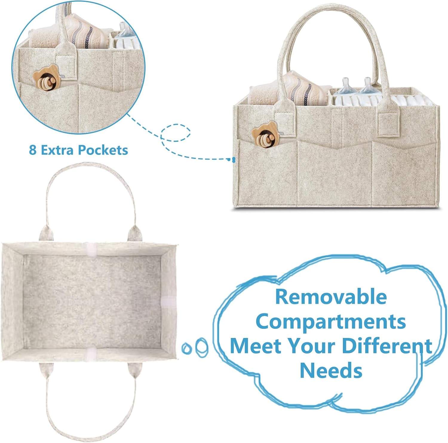 Removable compartments: Different from other nappy caddy organiser, our updated nappy organiser is designed with 2 removable dividers. So you have options for 1, 2 or 3 storage spaces for a tidy, organized space, perfect for all baby essentials