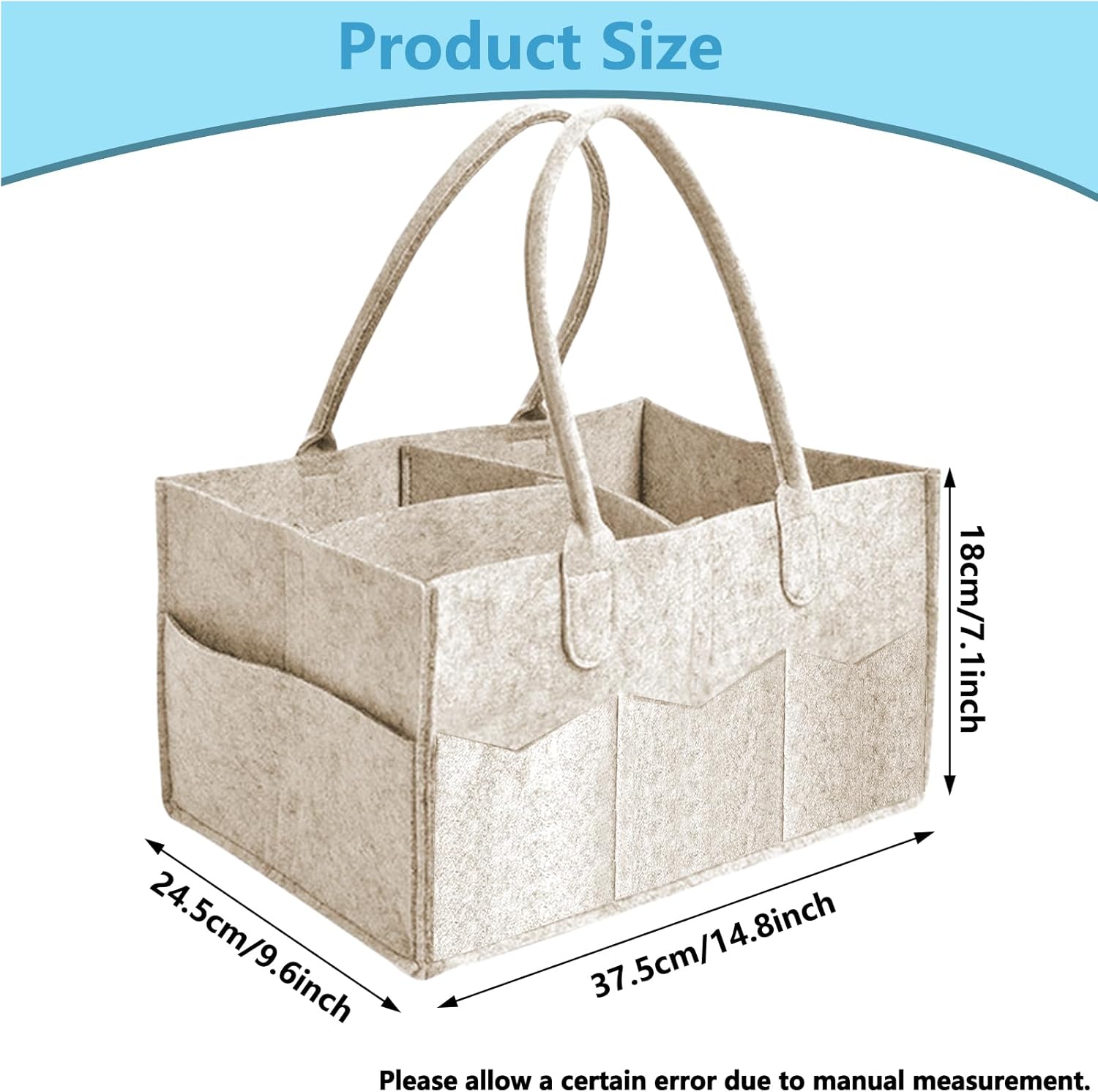 & Free ShippingConvenient Size For Baby Essentials: Our nappy caddy organizer(15×9.5×7 inch/38×24×18 CM) is large enough to storage lots of baby supplies. It keeps baby essentials all in one place so you don’t have to go searching for where the diaper, wipes were left. And there are 8 pockets on the outside to hold small toys, towels etc. Our baby diaper organizer will make your diaper changing station more organized