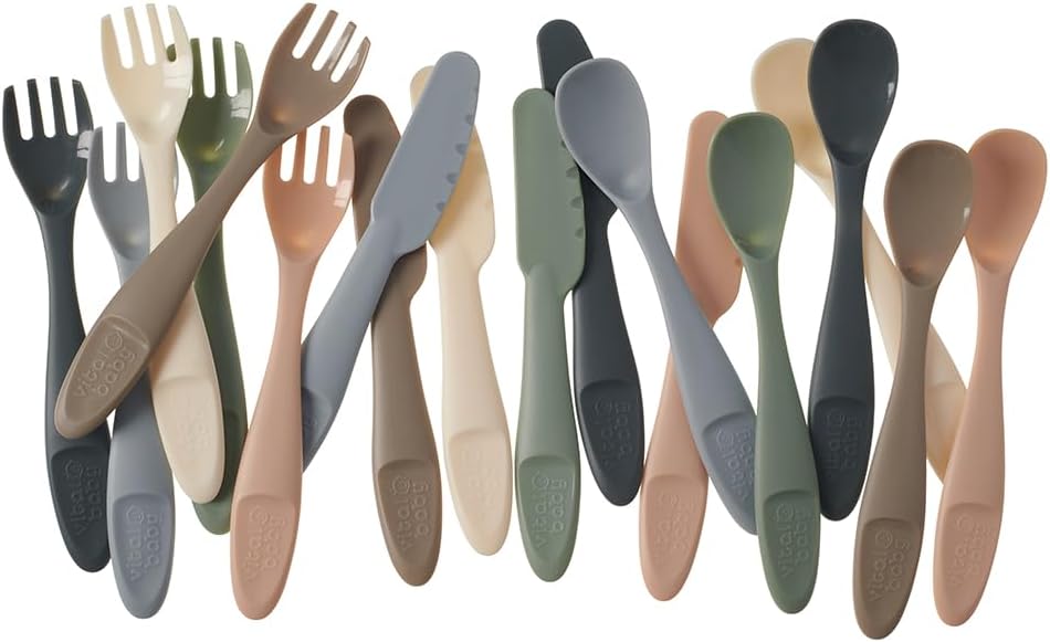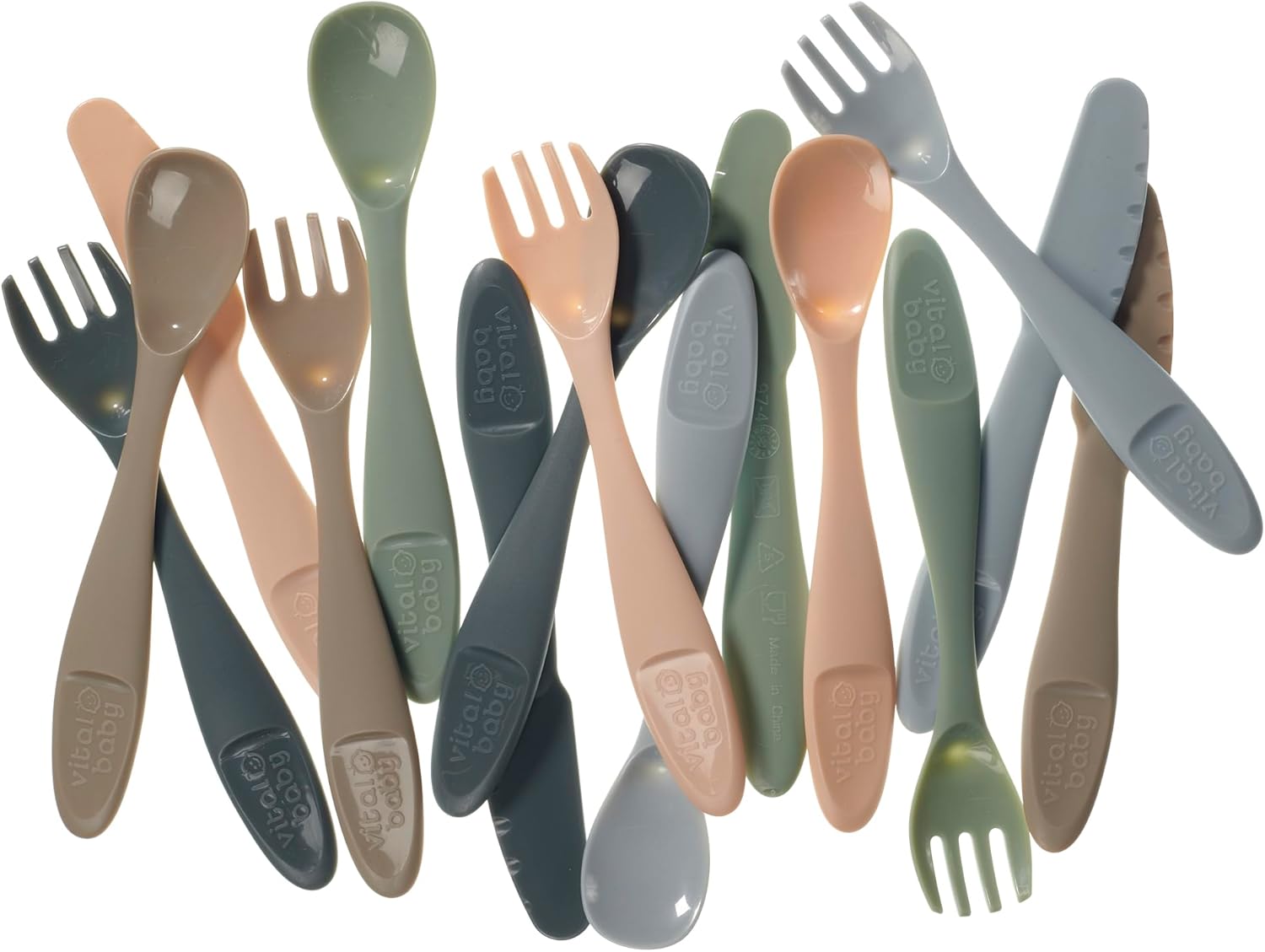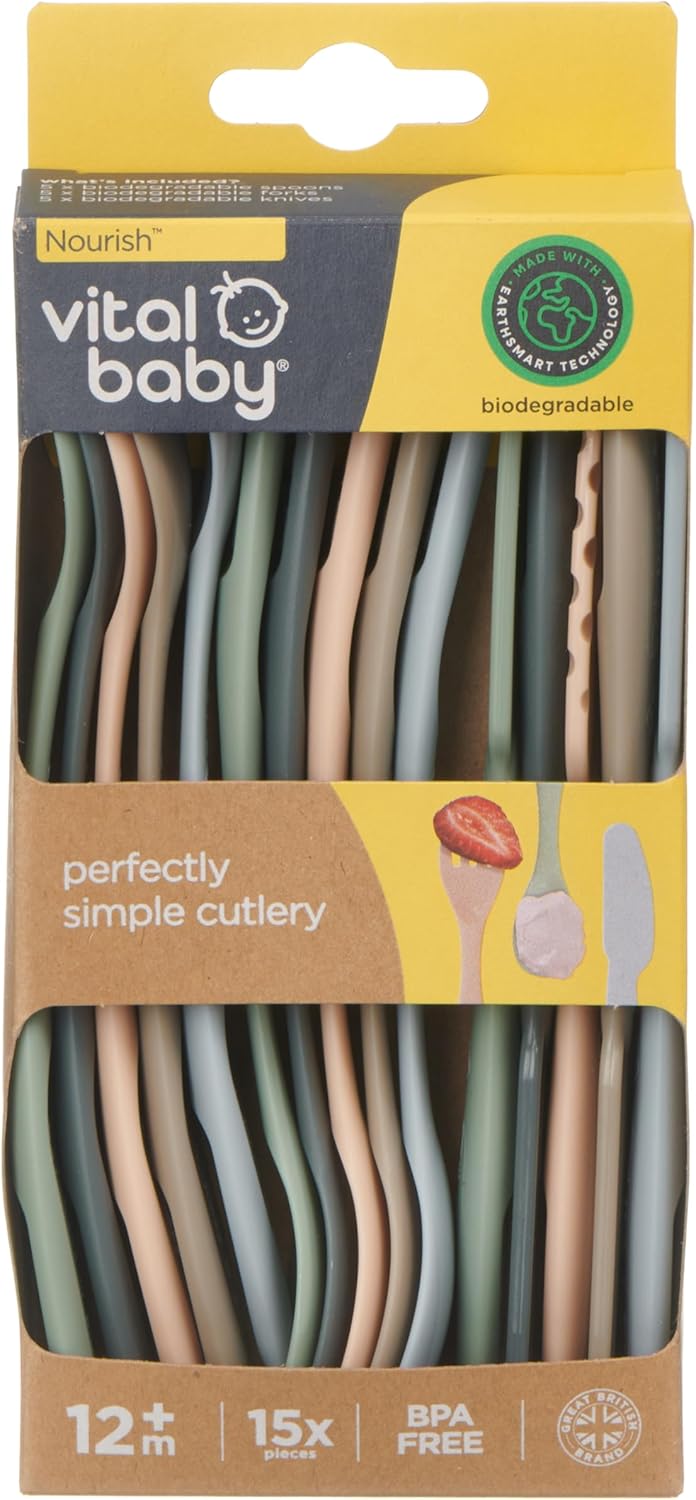 Vital Baby Nourish Perfectly Simple Cutlery, Child Safe, Chunky Handles, BPA Free, EarthSmart Biodegradable, Knives, Forks and Spoons for Toddlers and Family, 6 Months and Above, Pack of 15
