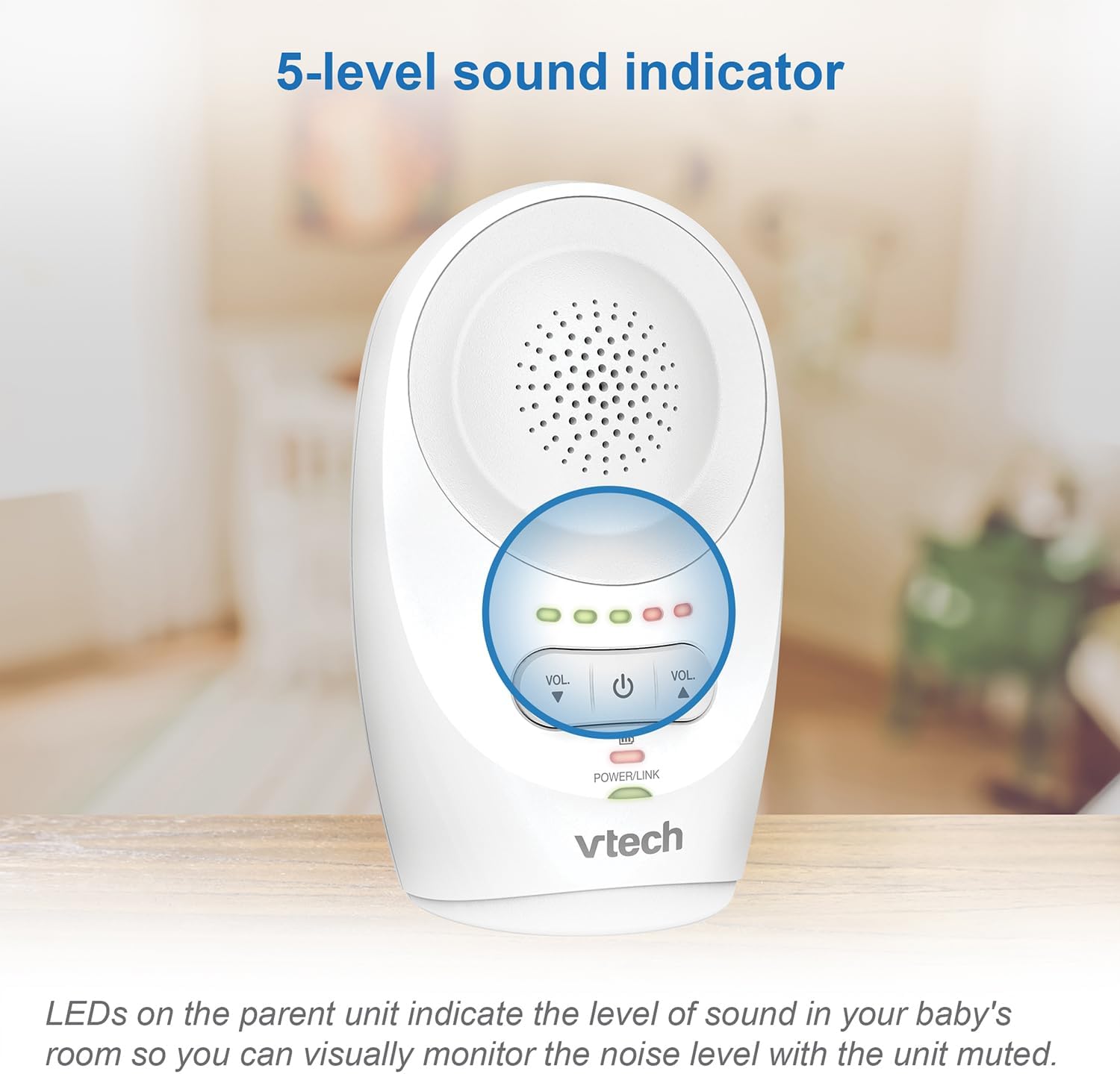 The 5-level LED volume indicator shows the noise level in the children’s room – for the peace of mind that the baby is doing well