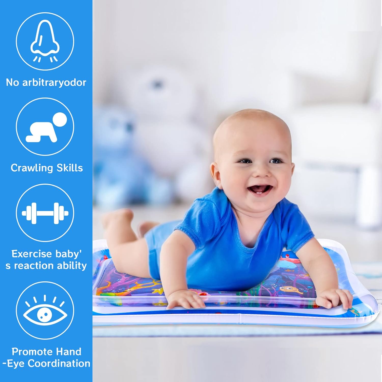 Promote your baby’s sensory development: This water mat is the perfect sensory toy to develop solid head, neck and shoulder muscles as well as to improve hand-eye coordination, fine motor skills and social skills