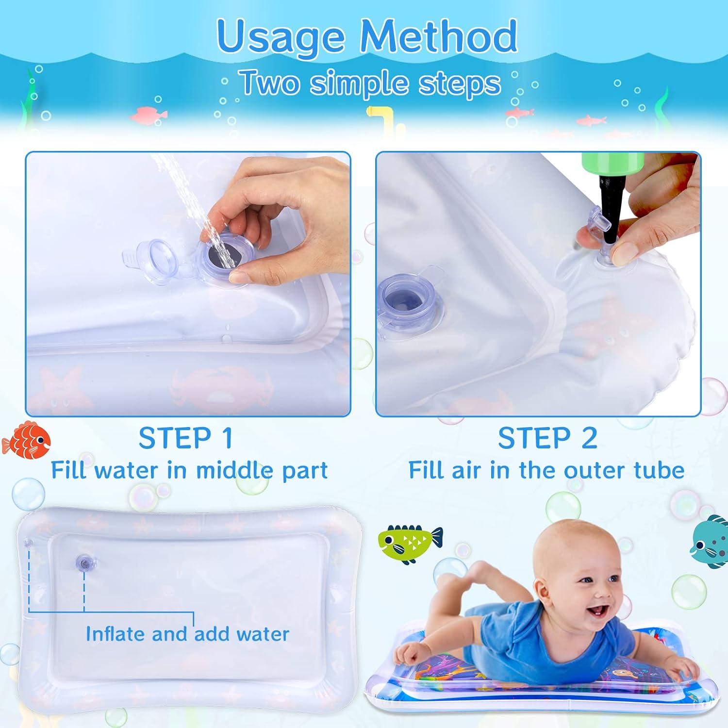 Safe and healthy for baby: our baby water play mat is made of 100% BPA-free and non-toxic, strong PVC material, CPC approved, durable and leak-proof