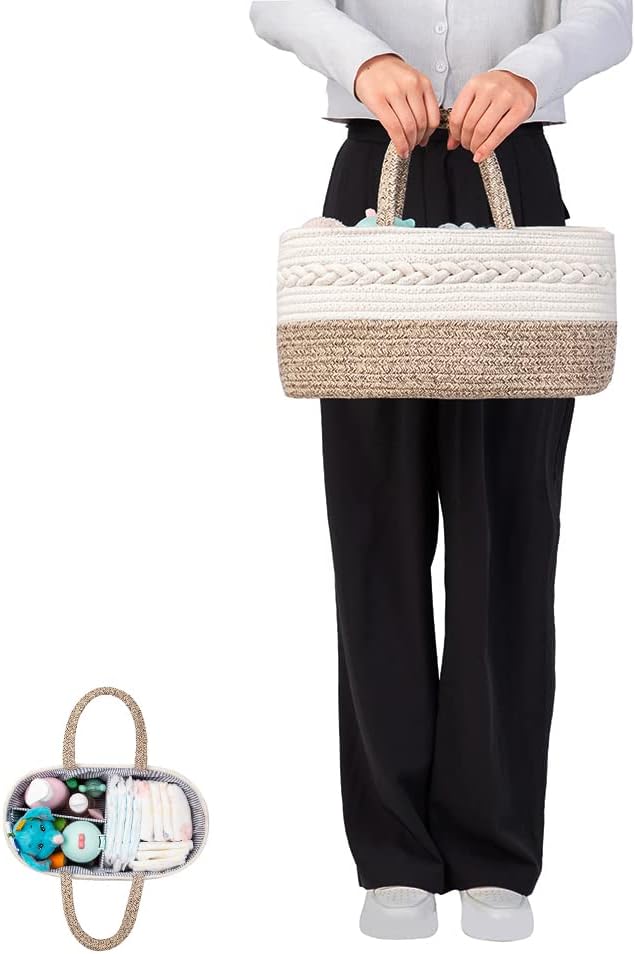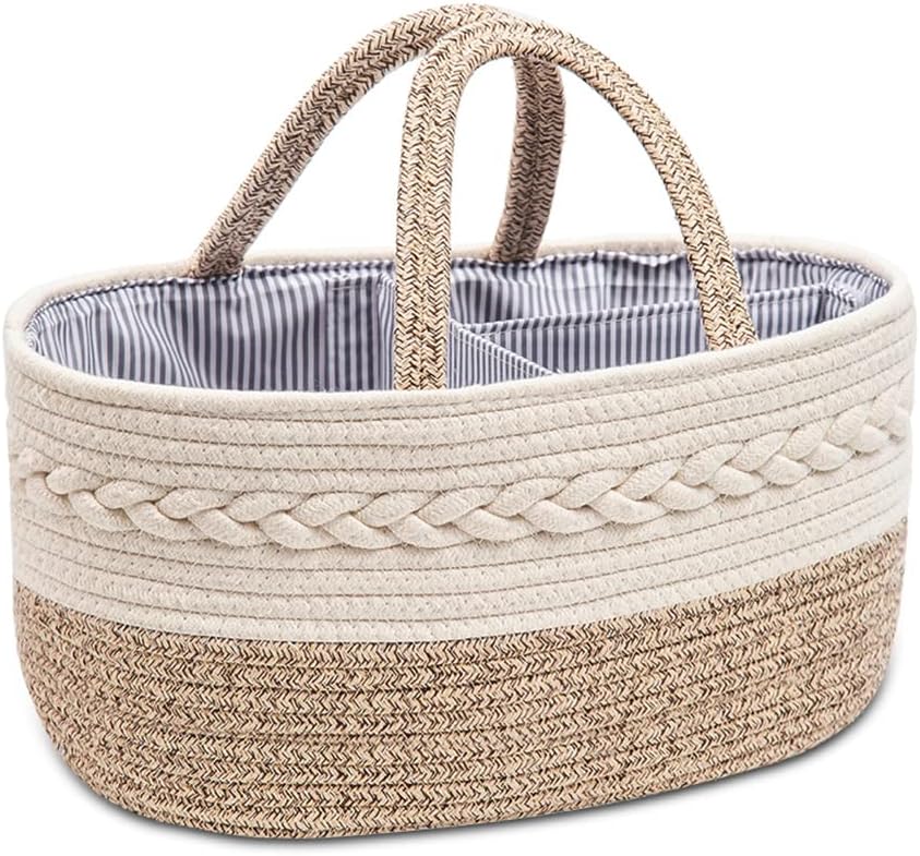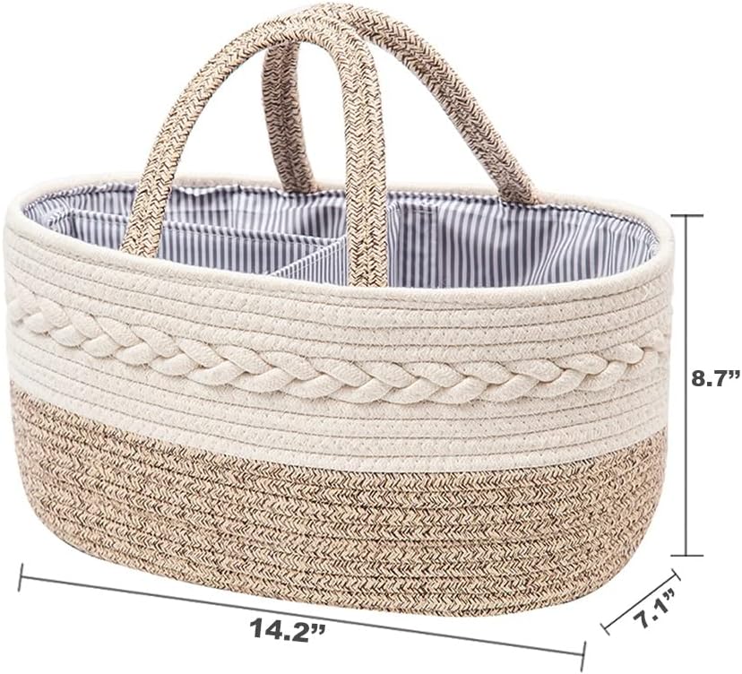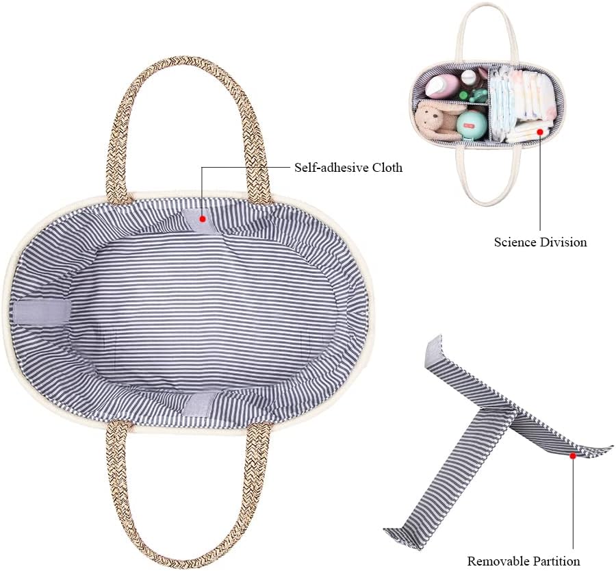 【DURABLE MATERIAL】: Our Diaper Caddy is made of 100% cotton material quite thick and sturdy. Rope handmade carefully, skin-friendly woven fabric design and lined with blue pin stripe fabric, which are safe choice for baby.