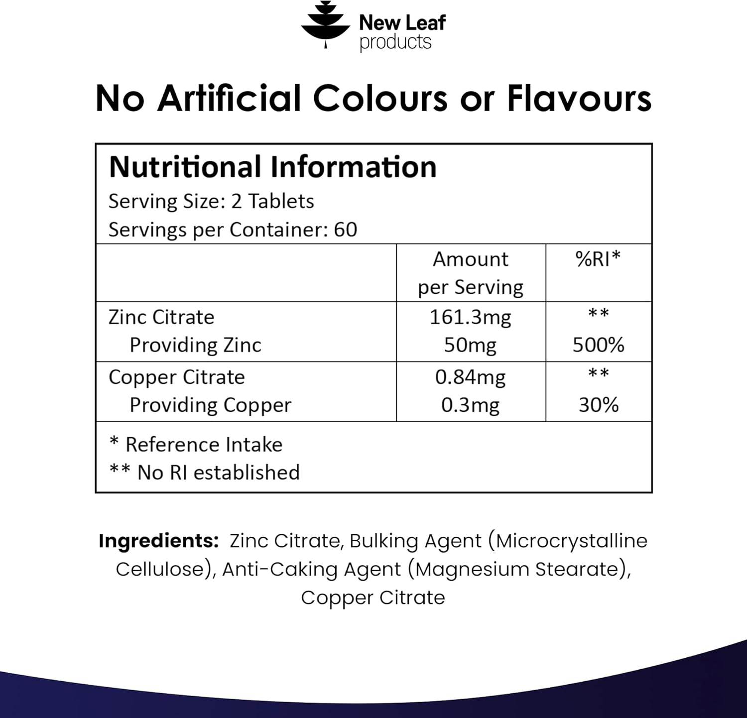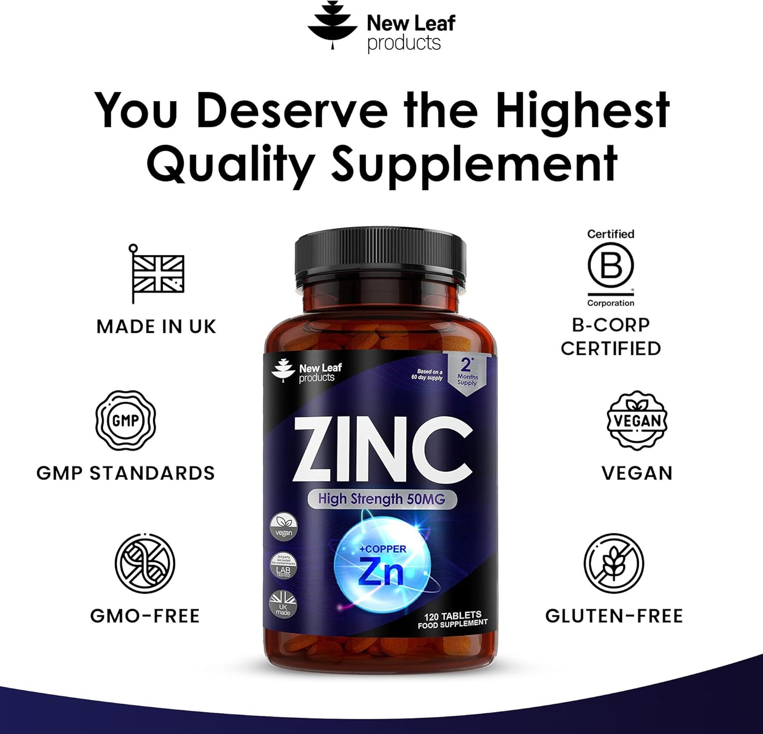 Zinc 50mg High Strength Tablets with Copper, Pure Zinc Supplements Contributes Towards The Immune System, Bone Health and Fertility, Vegan, Non-GMO, Made in UK by New Leaf 120 Tablets